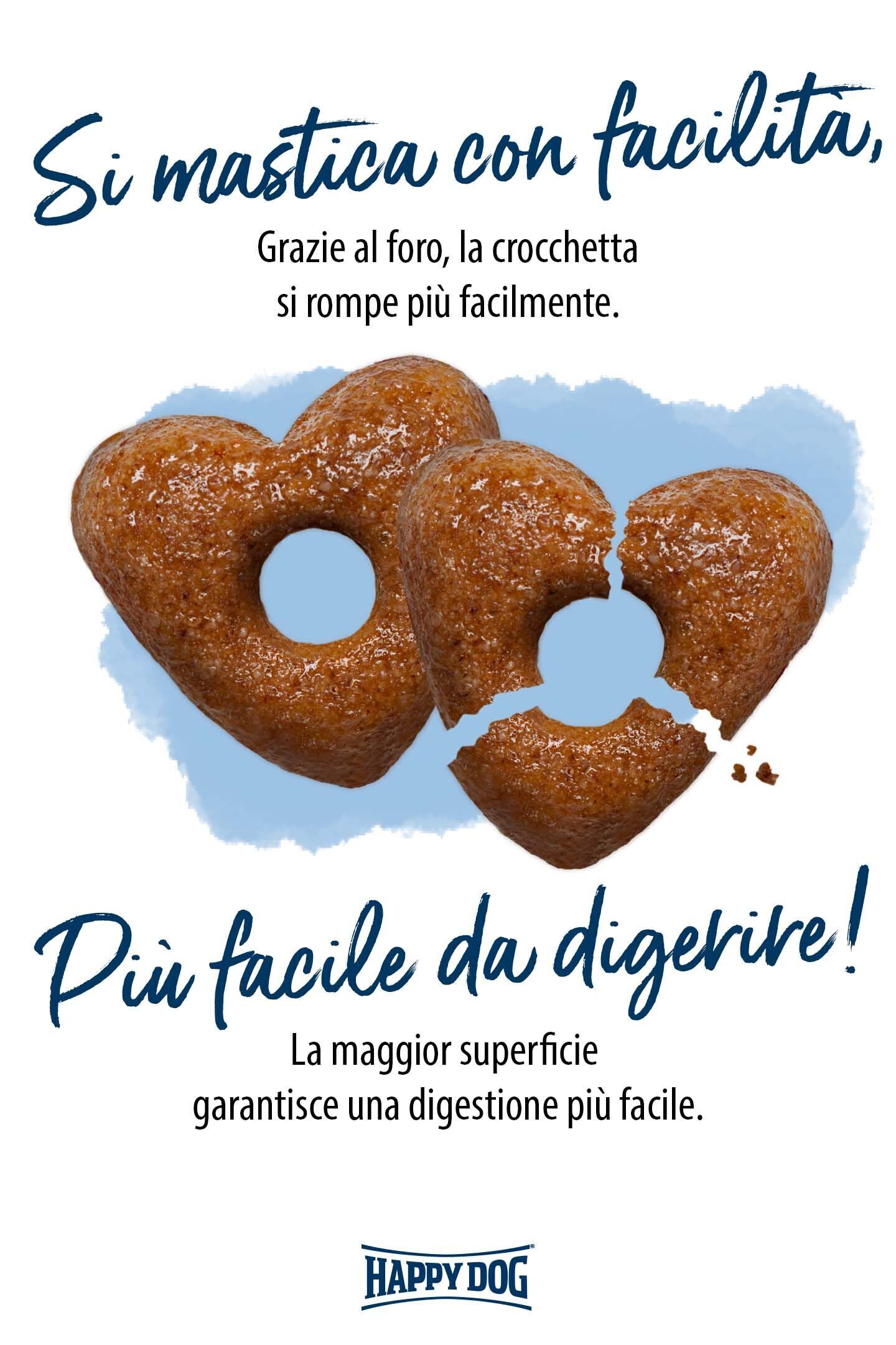Le crocchette per cuccioli sono a forma di cuore e hanno un buco nel mezzo. Questo le rende più facili da mordere e masticare. La maggiore superficie permette ai succhi gastrici di scomporle meglio, promuovendo quindi una digestione ottimale.