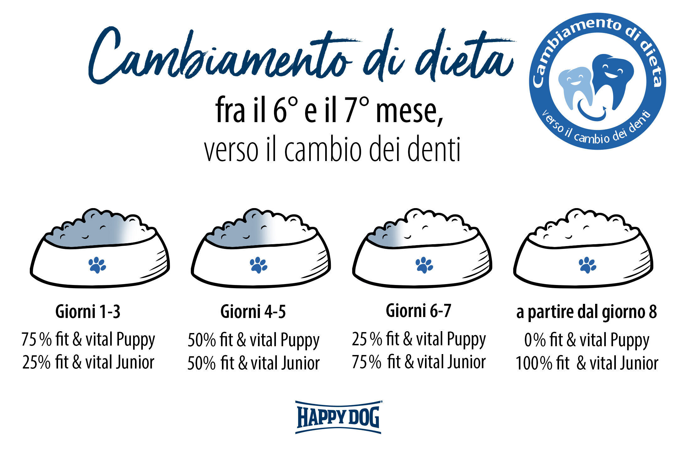 Il tuo amico a quattro zampe cresce in modo particolarmente veloce fino a circa 6 mesi di età. Dopo di che, inizia la fase del cane giovane con una crescita moderata. A questo punto, passa a un alimento per cani adatto a questa fase, come il nostro fit & vital Junior. Abitua lentamente il tuo cane alla nuova dieta, offrendogli giorno per giorno una porzione sempre maggiore. Questo permetterà al suo tratto gastrointestinale di adattarsi al cambiamento.