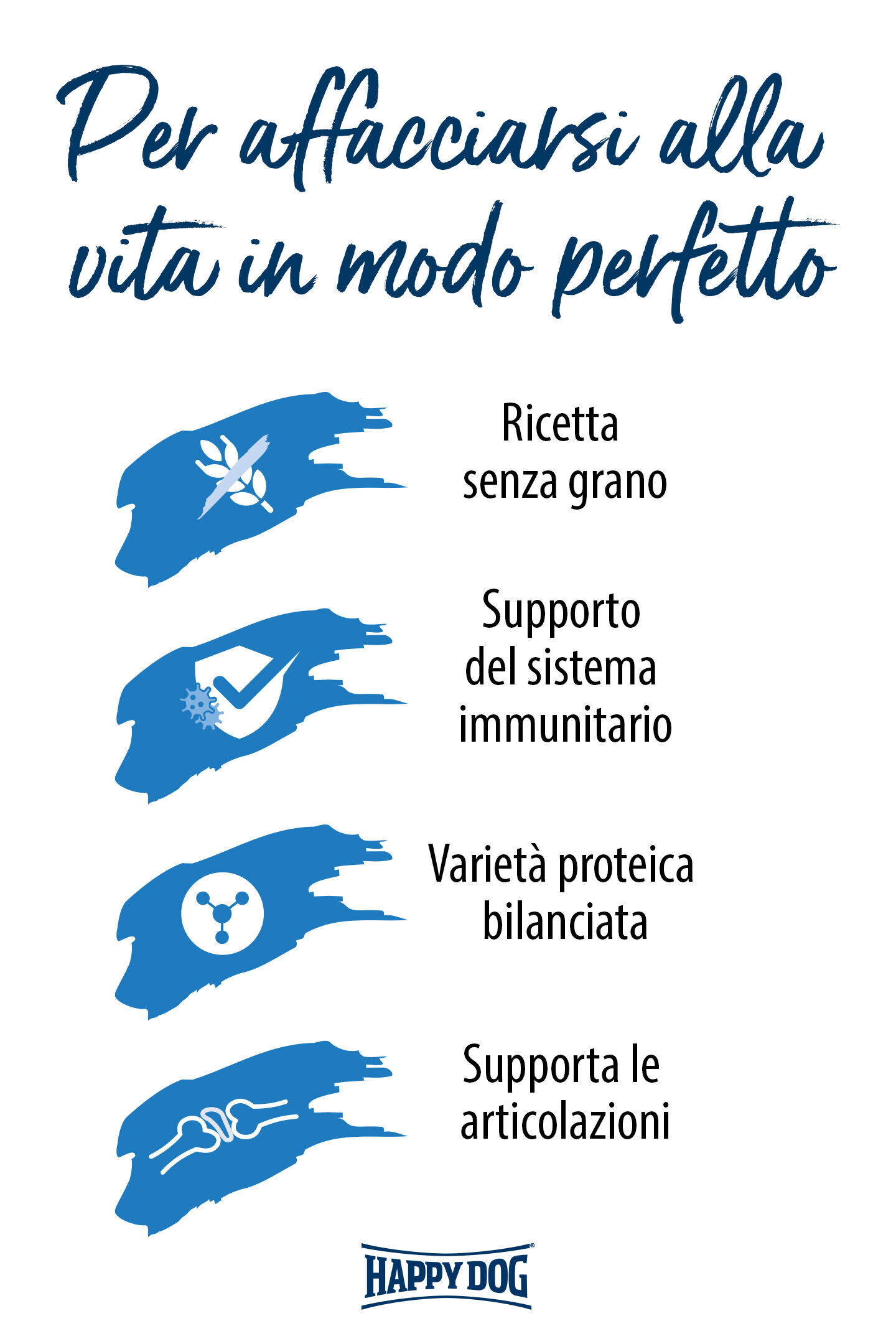 Durante la prima importante fase di vita, dal primo al sesto mese di vita, il cucciolo cresce molto intensamente. Per svilupparsi in modo sano occorrono quindi più sostanze nutritive. L’alimento bilanciato per cuccioli di Happy Dog fit & vital Puppy supporta la crescita sana del nuovo membro della tua famiglia. Il gustoso alimento completo offre proteine provenienti da 5 prodotti animali selezionati. Fornisce inoltre al tuo cucciolo molti nutrienti naturali: i semi di lino contengono acidi grassi omega 3 e omega 6, che promuovono la crescita di un pelo lucido e una pelle sana. lo zenzero rafforza il sistema immunitario e fa bene alle articolazioni del tuo cucciolo, così come la polpa di molluschi della Nuova Zelanda. Quindi è un prodotto ideale per la fase di crescita principale.