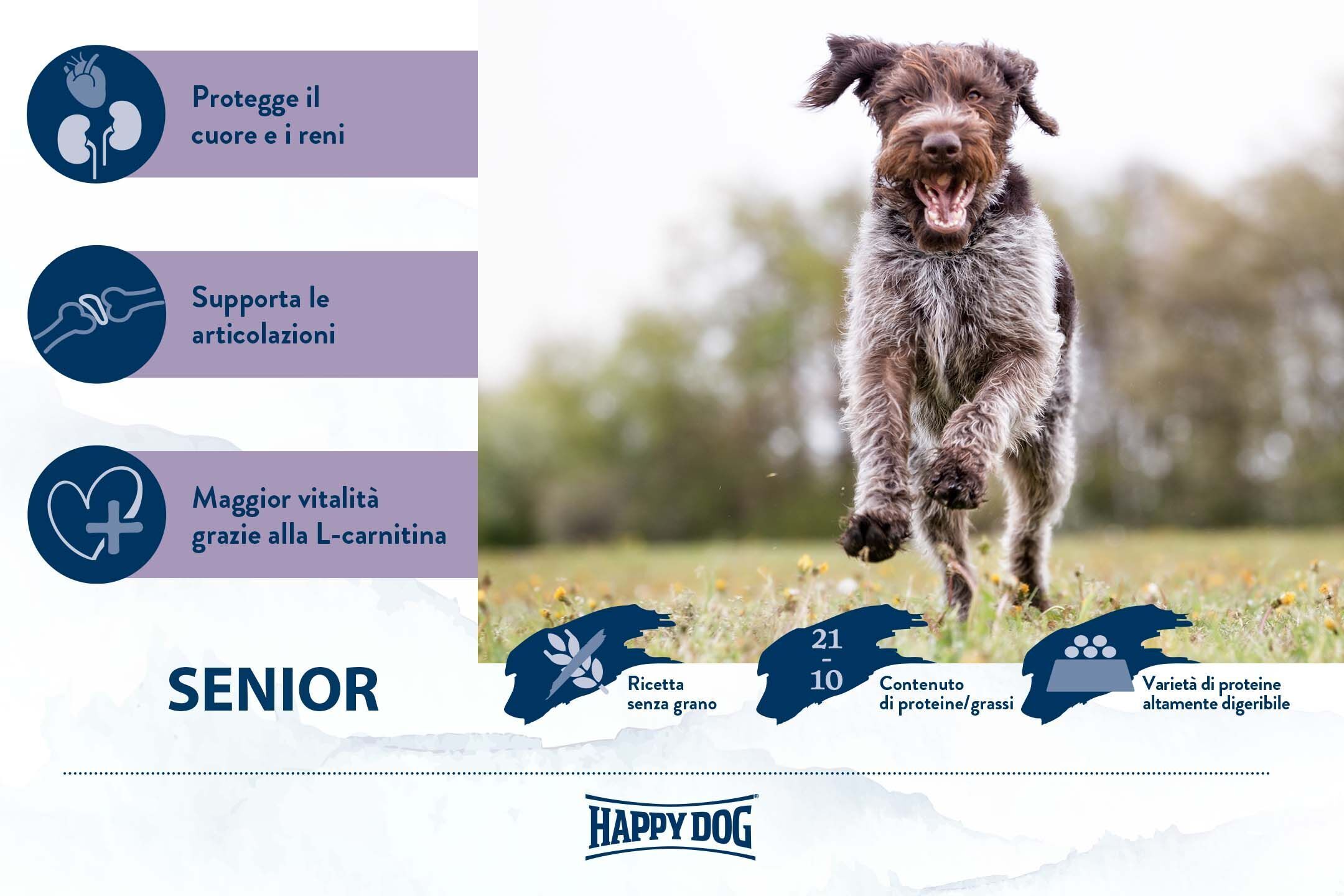 Happy Dog fit & vital Senior è specifico per le esigenze dei cani più anziani poiché, con l’avanzare dell’età, il metabolismo cambia. Questo cibo a base di alimenti integrali, gustoso e ben tollerato, ha un contenuto ottimale di proteina, fosforo e sodio, protegge gli organi ed è completato dallo straordinario Happy Dog Natural Life Concept®. La formula rispettosa degli organi e senza grano è arricchita con L-carnitina vitalizzante e, grazie ai molluschi della Nuova Zelanda, procura un piacere maggiore nel fare esercizio; inoltre la vitamina C sostiene le difese del corpo. La vitalità, il sistema immunitario e la gioia di vivere possono così esistere anche in età avanzata, garantendo ancora molti momenti meravigliosi con il proprio amico a quattro zampe.
