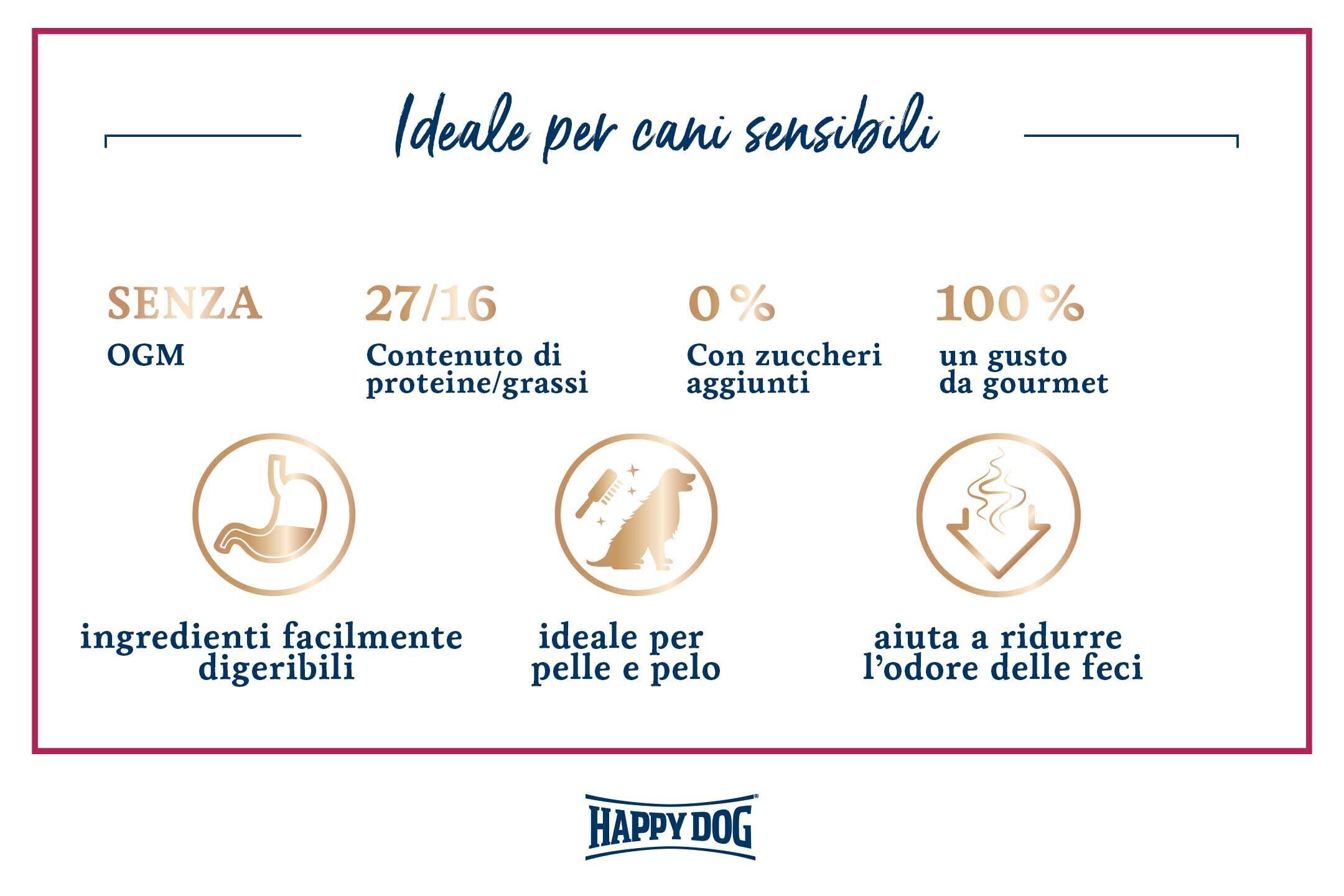 Proteina grezza 27,0 %, grassi grezzi 16,0 %, fibra grezza 3,5 %, ceneri grezze 8,5 %, calcio 1,5 %, fosforo 0,95 %, sodio 0,45 %, acidi grassi omega-6 4,0 %, acidi grassi omega-3 0,4 %