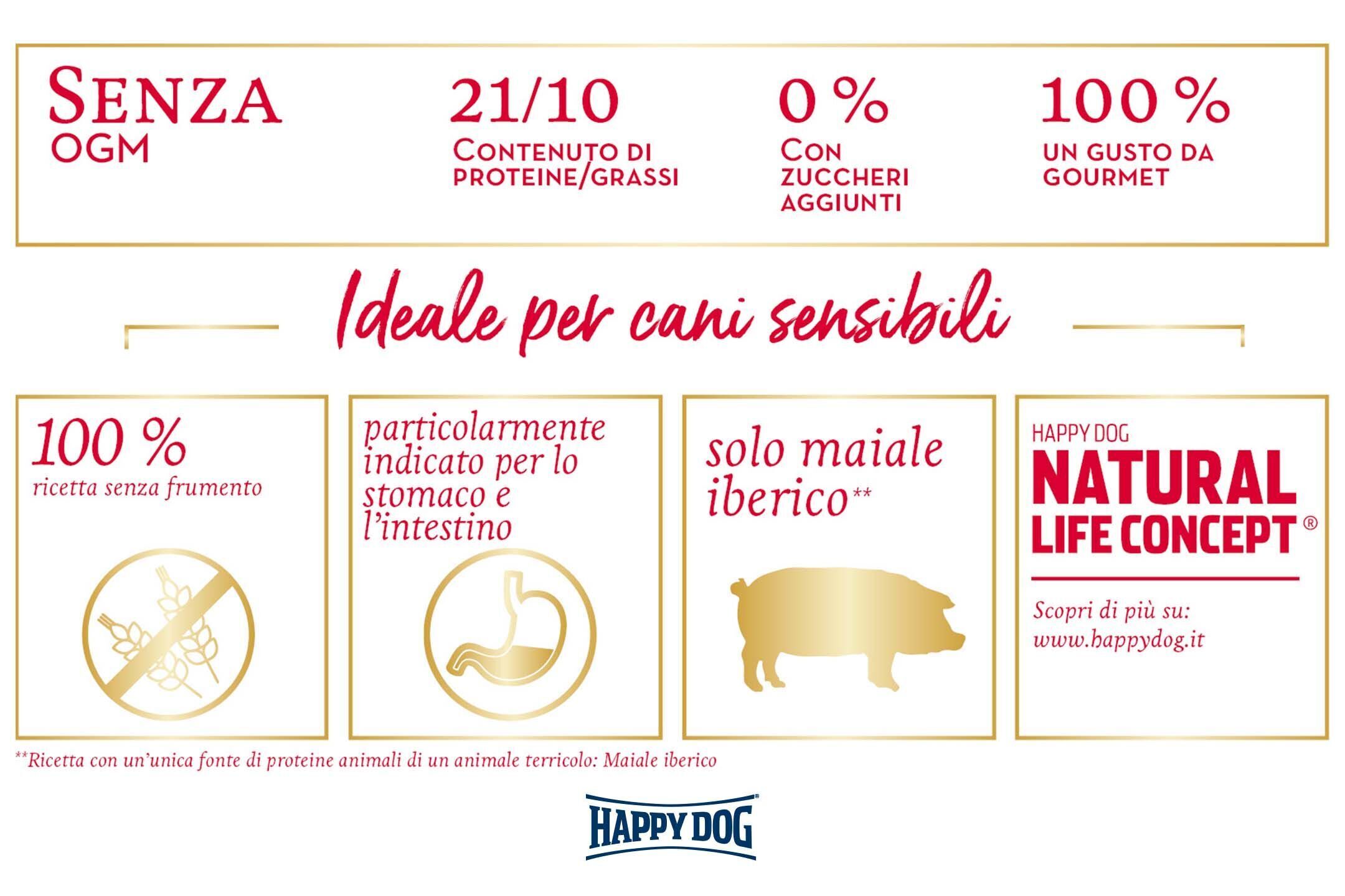 Offri al tuo cane una dieta equilibrata con la ricetta senza cereali e senza glutine del nostro menu di riso mediterraneo, fatto con tenero suino iberico e raffinate verdure selezionate. Le proteine del suino iberico hanno una tollerabilità ottimale e sono quindi particolarmente delicate con lo stomaco e l’intestino del tuo amico peloso. Una vera delizia che può garantire un pelo lucido, anche grazie a molti acidi grassi omega 3 e 6 provenienti dall'olio di girasole e di colza. Gli ingredienti accuratamente selezionati e naturalmente puri rendono il prodotto estremamente gradevole e ben tollerato dal tuo animale.