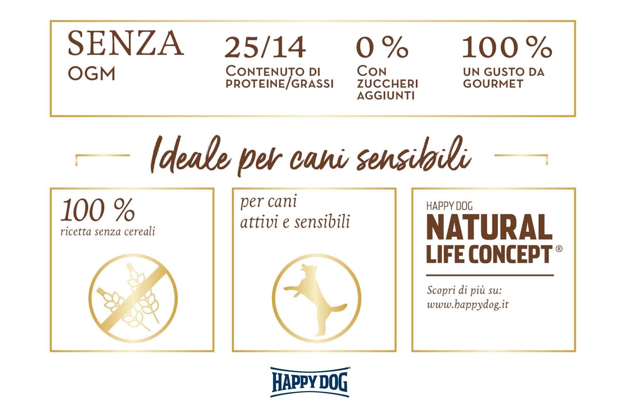 Offri al tuo buongustaio una squisita ricetta a base di delicato salmone, gustoso coniglio e agnello nutriente, con aggiunta di patate senza glutine. Una vera delizia. Il salmone è ricco di acidi grassi essenziali omega 3 e omega 6, mentre il coniglio fornisce proteine biologicamente preziose e l'agnello molti minerali importanti. Sulla base dell'esclusivo Happy Dog Natural Life Concept®, i molluschi della Nuova Zelanda supportano le articolazioni mentre i preziosi acidi grassi omega 3 e omega 6, derivati dall’olio di semi di girasole e di colza, assicurano un pelo lucido e una pelle sana.