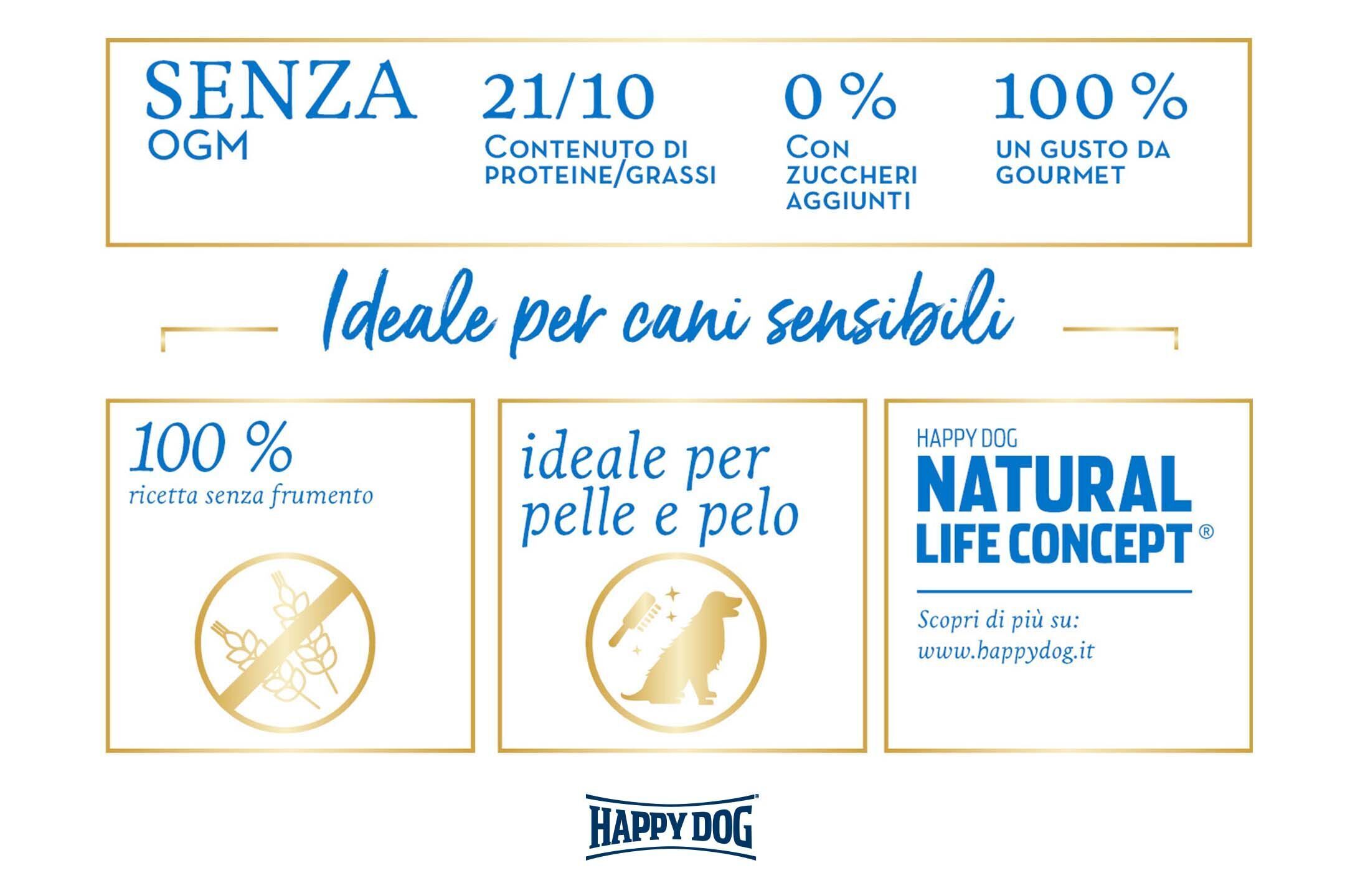 Happy Dog Neuseeland è un alimento completo eccezionalmente gustoso, ideale per tutti i buongustai adulti dagli 11 kg in su a cui piace cambiare o che hanno una digestione particolarmente sensibile.