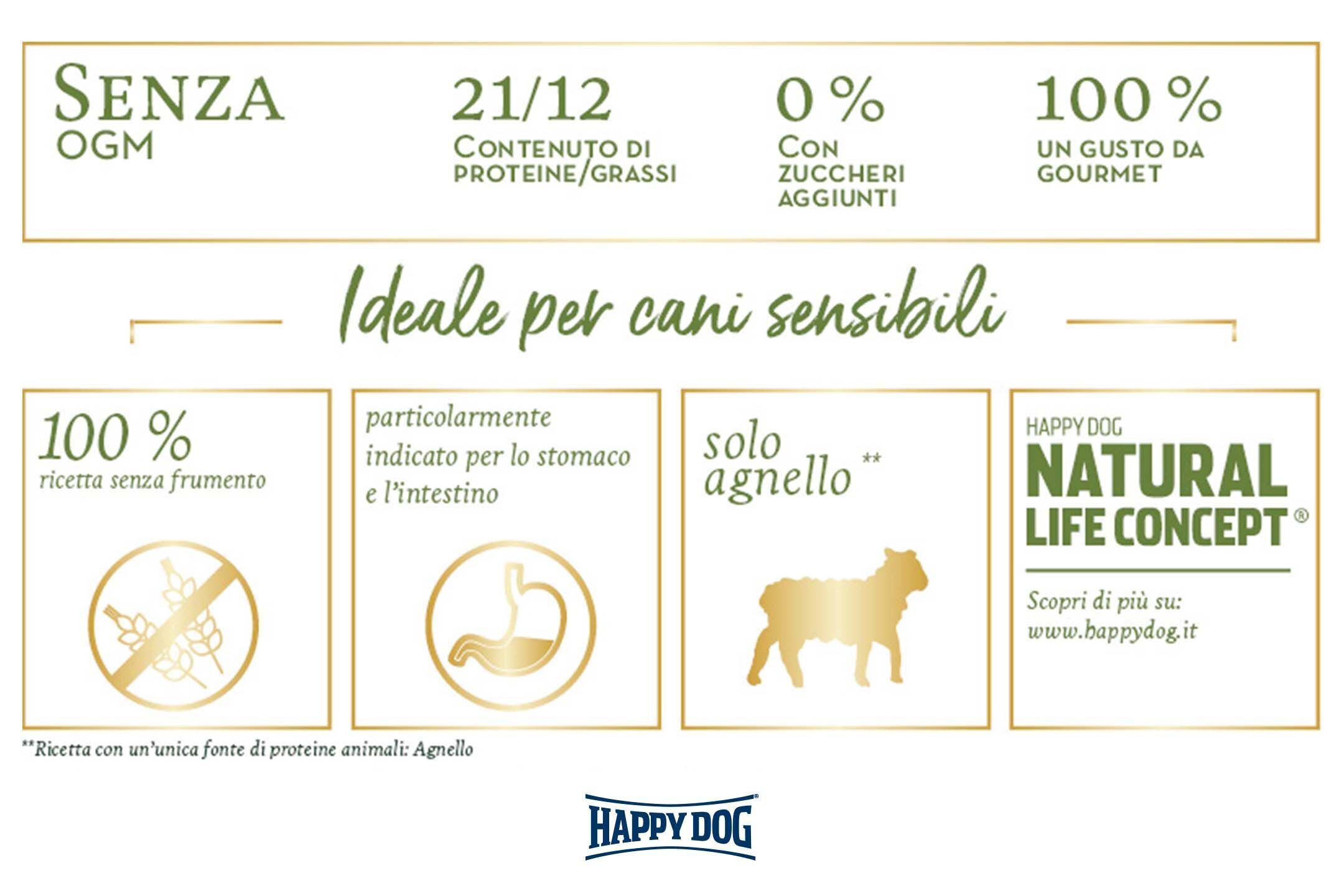 Regala al tuo amico a quattro zampe un vero momento di gusto con la sana ricetta di Happy Dog New Zealand. Una vera delizia che protegge stomaco e intestino grazie all'agnello, facilmente digeribile, e alla ricetta senza glutine. Gli ingredienti accuratamente selezionati e naturalmente puri rendono il prodotto estremamente gradevole e ben tollerato dal tuo animale. Sulla base dell'esclusivo Happy Dog Natural Life Concept®, i molluschi della Nuova Zelanda supportano le articolazioni mentre i preziosi acidi grassi omega 3 e omega 6 garantiscono un pelo lucido.