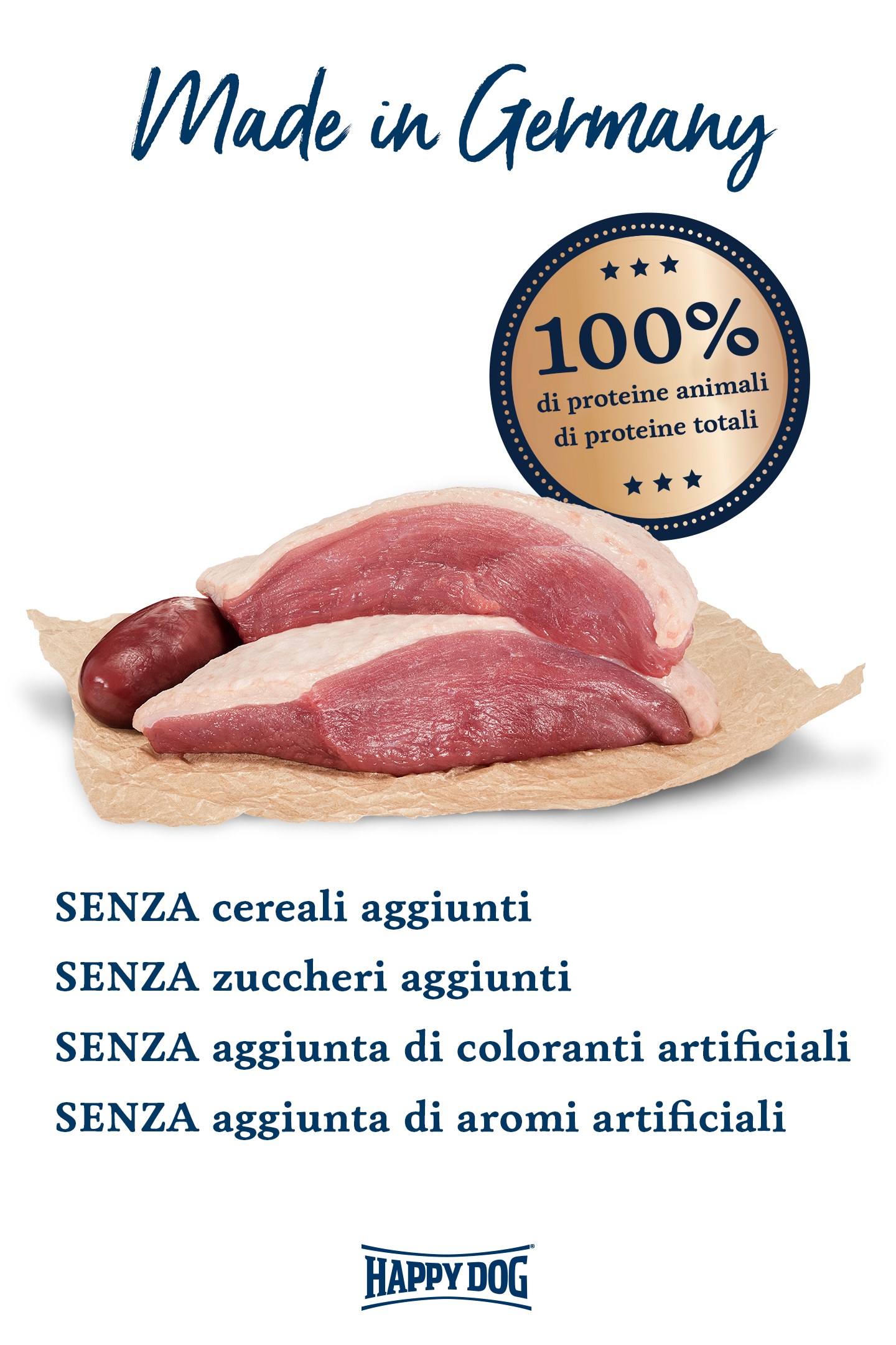 L’alimento umido Happy Dog anatra pura porta un pezzo di natura nella ciotola. Questo alimento pregiato è ricavato al 100% dalla carne e dalle frattaglie migliori, come cuore, polmoni e fegato, e contiene vitamine e minerali vitali. La carne e le frattaglie provengono esclusivamente da anatre*. Naturalmente, questo alimento umido è prodotto senza soia o altri additivi vegetali.