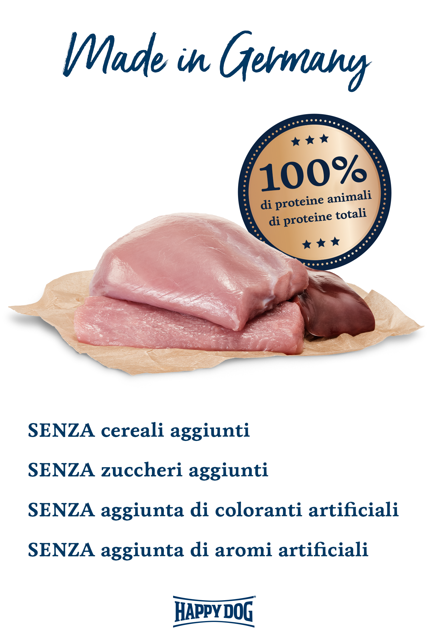L’alimento umido Happy Dog capra pura porta un pezzo di natura nella ciotola. Il nostro alimento pregiato è ricavato al 100% da pregiata carne e frattaglie, come cuore, polmoni e fegato, e contiene vitamine e minerali vitali. La carne e le frattaglie provengono esclusivamente dalla capra*. Questo alimento umido è prodotto senza soia o altri additivi vegetali.