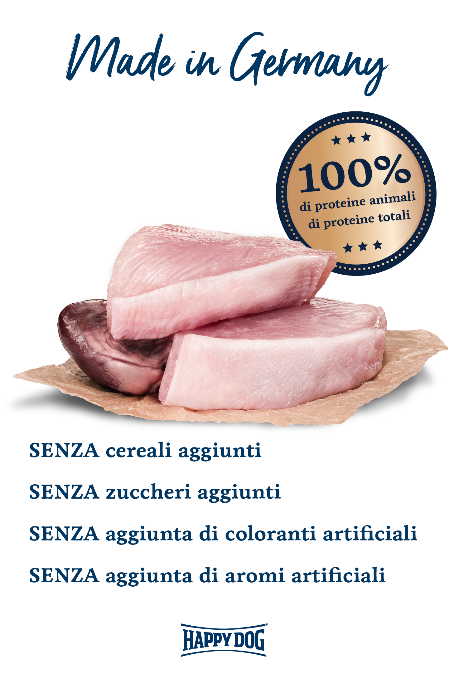 L’alimento umido Happy Dog Turkey Pur porta un pezzo di natura nella ciotola. Questo alimento a base di carne di alta qualità è fatto al 100% di carne e frattaglie pregiate, come cuore, polmoni e fegato, e contiene importanti vitamine e minerali. La carne e le frattaglie provengono solo dal tacchino*. Questo alimento umido premium è prodotto senza soia o altri additivi vegetali.
