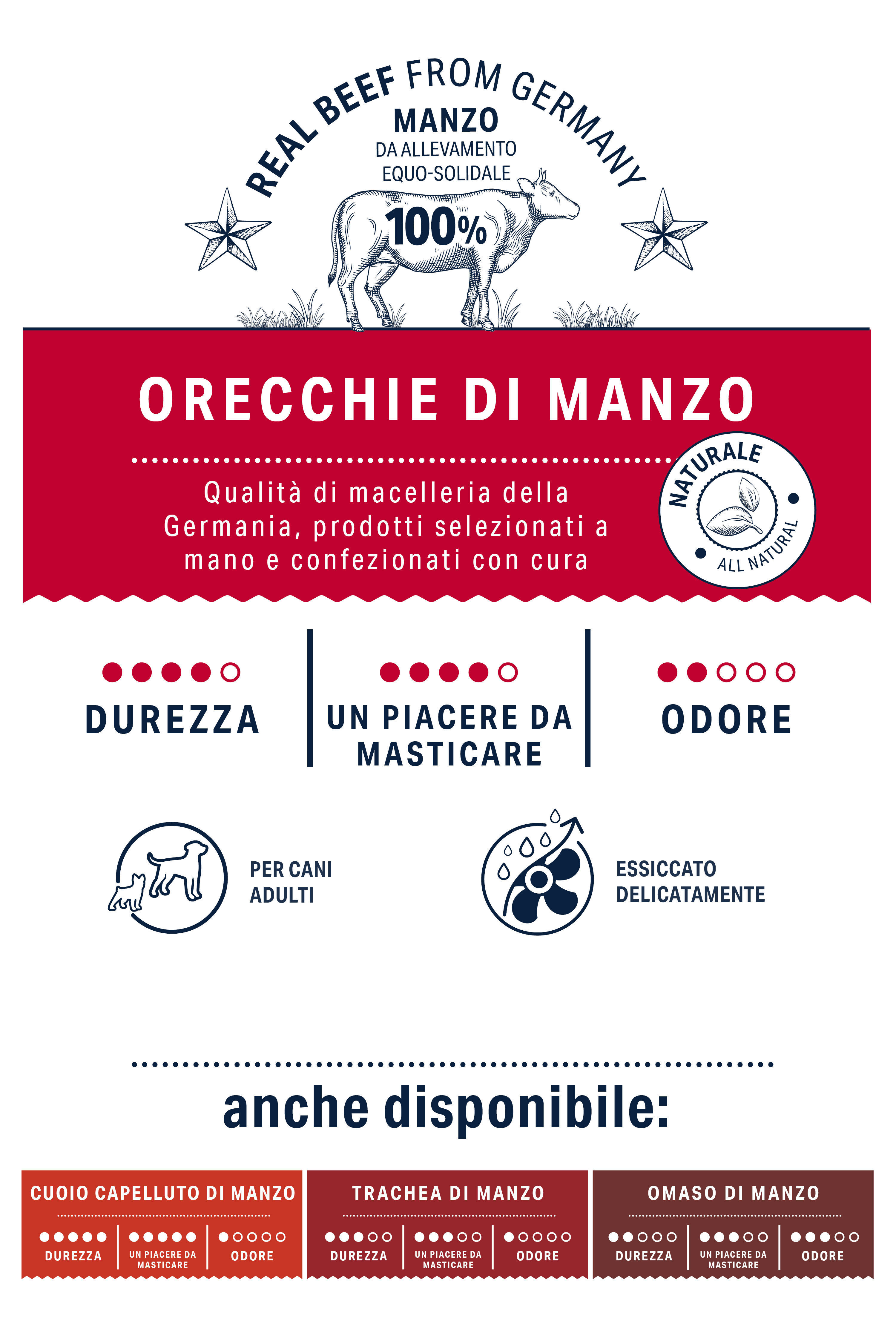 Le orecchie di manzo sono caratterizzate da un basso contenuto di grassi ma da un elevato contenuto di proteine e sono ben tollerate. Lo snack proviene da bovini allevati in condizioni adeguate alla specie, è naturalmente privo di cereali e zuccheri ed è delicatamente essiccato senza conservanti.