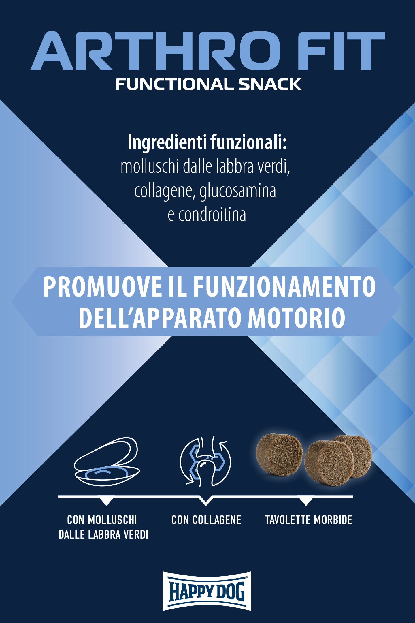 Le articolazioni dei nostri amici a quattro zampe sono sottoposte a uno stress quotidiano quando giocano o si allenano. Happy Dog Care Snack Arthro Fit è stato sviluppato per sostenere la naturale funzionalità delle articolazioni. Questo snack per cani non solo è particolarmente gustoso, ma fornisce anche un ulteriore supporto all’apparato motorio grazie ai preziosi molluschi dalle labbra verdi e al collagene idrolizzato. I morbidi bocconcini che compongono questo snack funzionale per cani sono pratici da dosare. Questi snack per cani sono prodotti in Germania, in modo naturale, senza zuccheri aggiunti e senza aromi, coloranti o conservanti artificiali.
