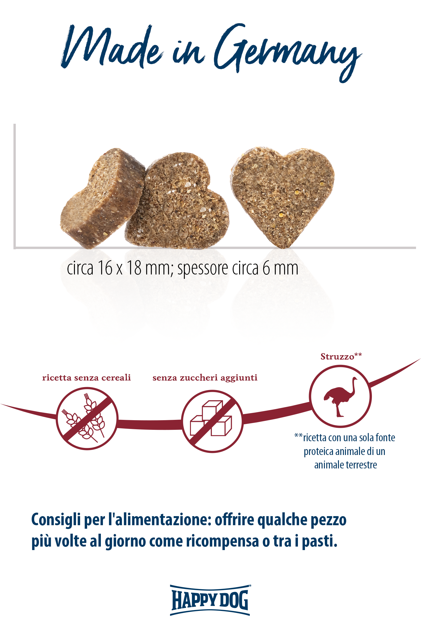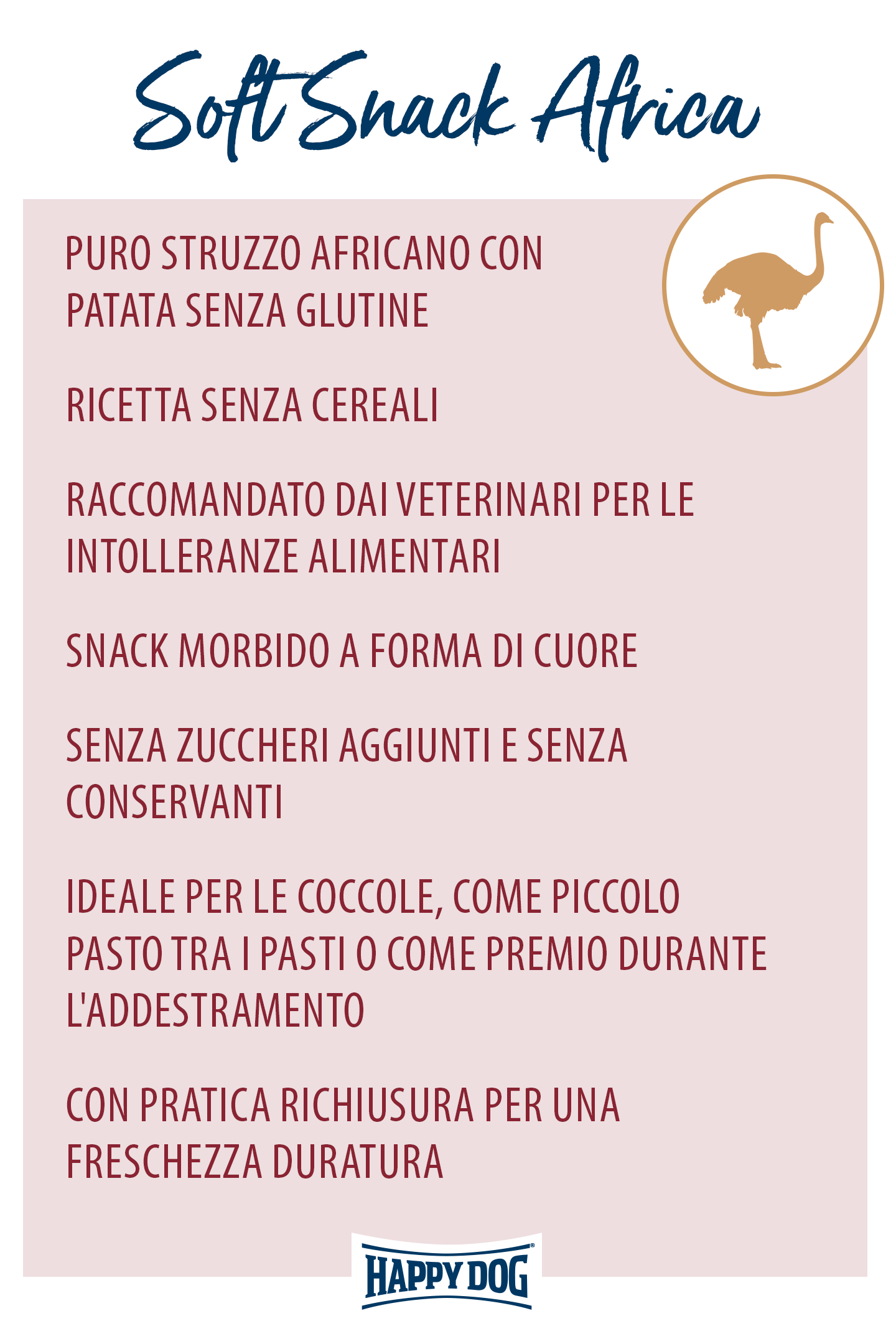 Il morbido snack Africa a forma di cuore è ideale per viziare il tuo amico o come piccolo spuntino fra un pasto e l’altro. In questo snack delizioso combiniamo la rara fonte proteica dello struzzo con la patata senza glutine. Questa ricetta priva di cereali è particolarmente idonea per cani sensibili ed esigenti di medie e grandi dimensioni ed è raccomandata dai veterinari in caso di intolleranze alimentari. Gli snack sono prodotti senza l'aggiunta di zuccheri e conservanti e hanno una pratica richiusura per mantenere la loro freschezza. Regala al tuo amico peloso dei momenti di coccole indulgenti!