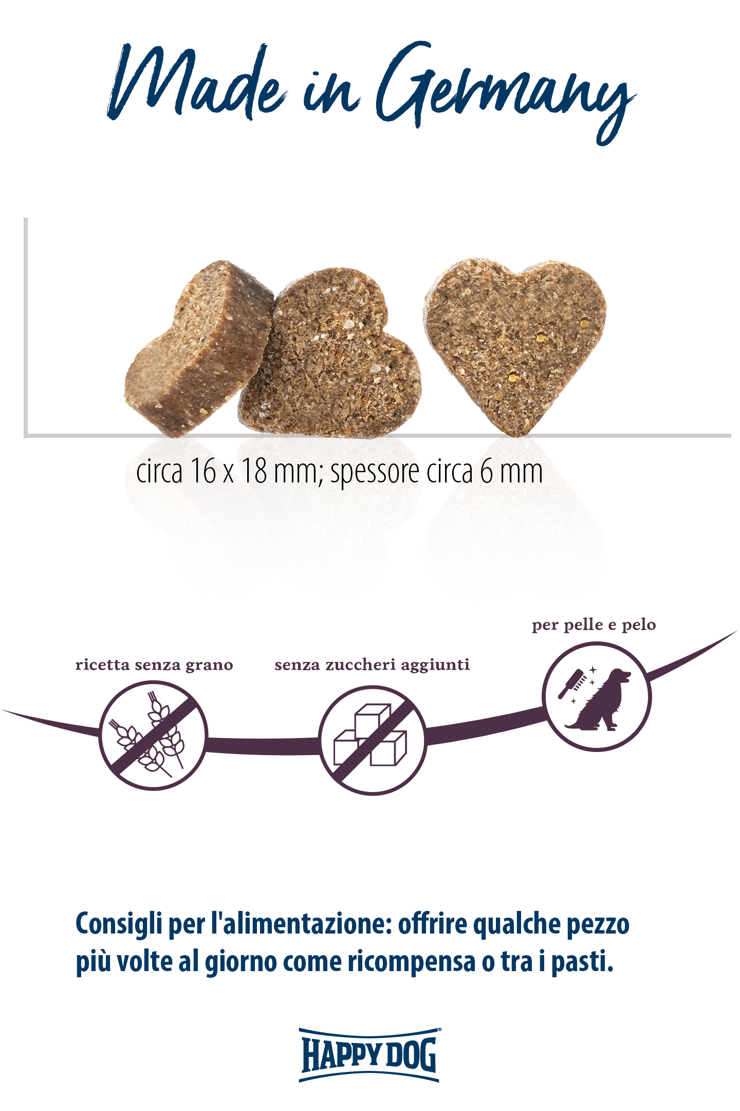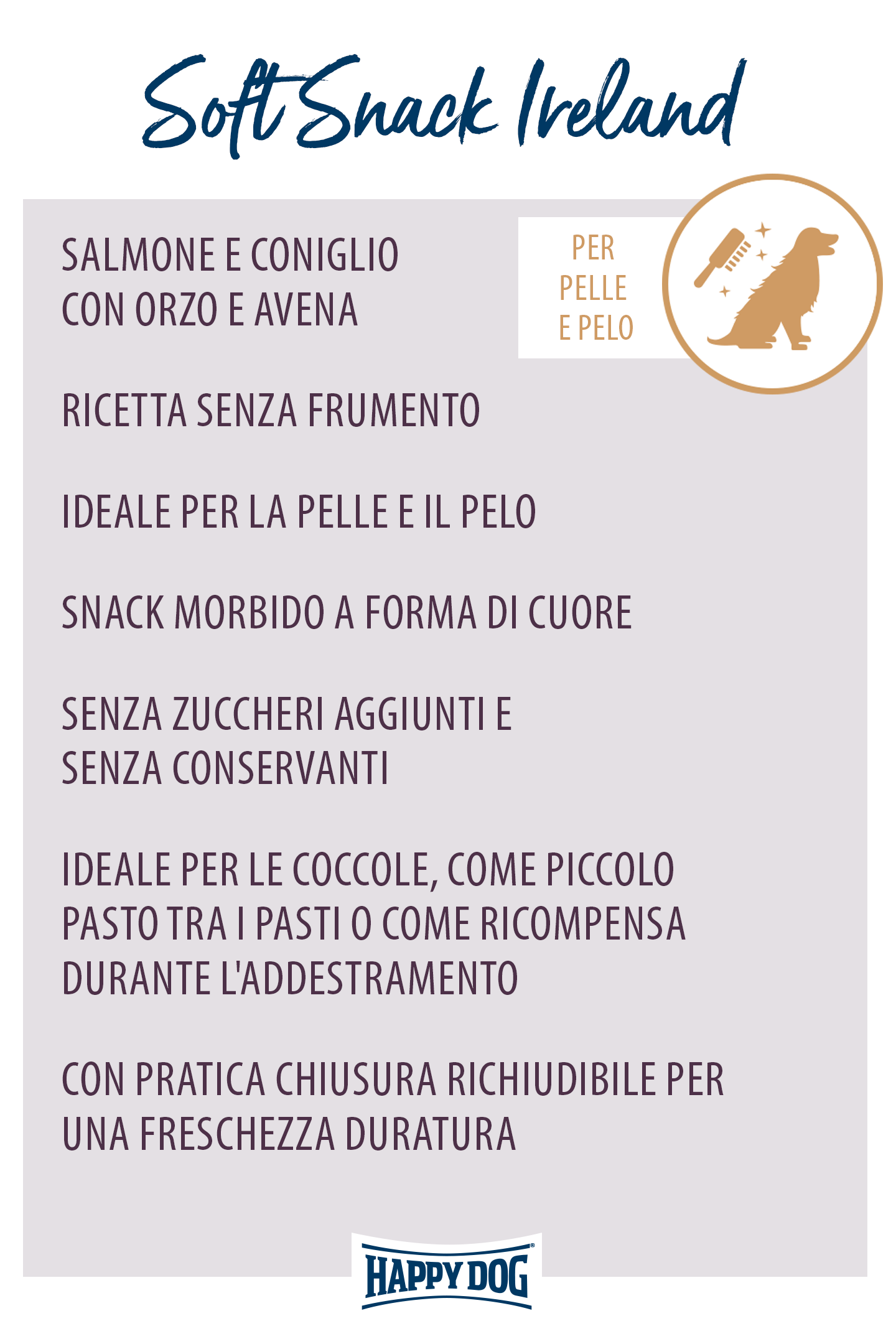 Un bocconcino per viziarlo un po’? Prova i piccoli snack a forma di cuore di Ireland, ideali per coccolare il tuo amico a quattro zampe o come piccolo gustoso intervallo. Il salmone delicato e il coniglio saporito sono estremamente gustosi e i numerosi acidi grassi omega 3 e omega 6 assicurano un pelo lucido. Questa ricetta priva di cereali è ben tollerata sia dai cani sensibili che da quelli esigenti di taglia media e grande. Non aggiungiamo zucchero o conservanti nella produzione degli snack. I sacchetti hanno una pratica chiusura richiudibile per una freschezza duratura. Il gusto rimane quindi garantito!