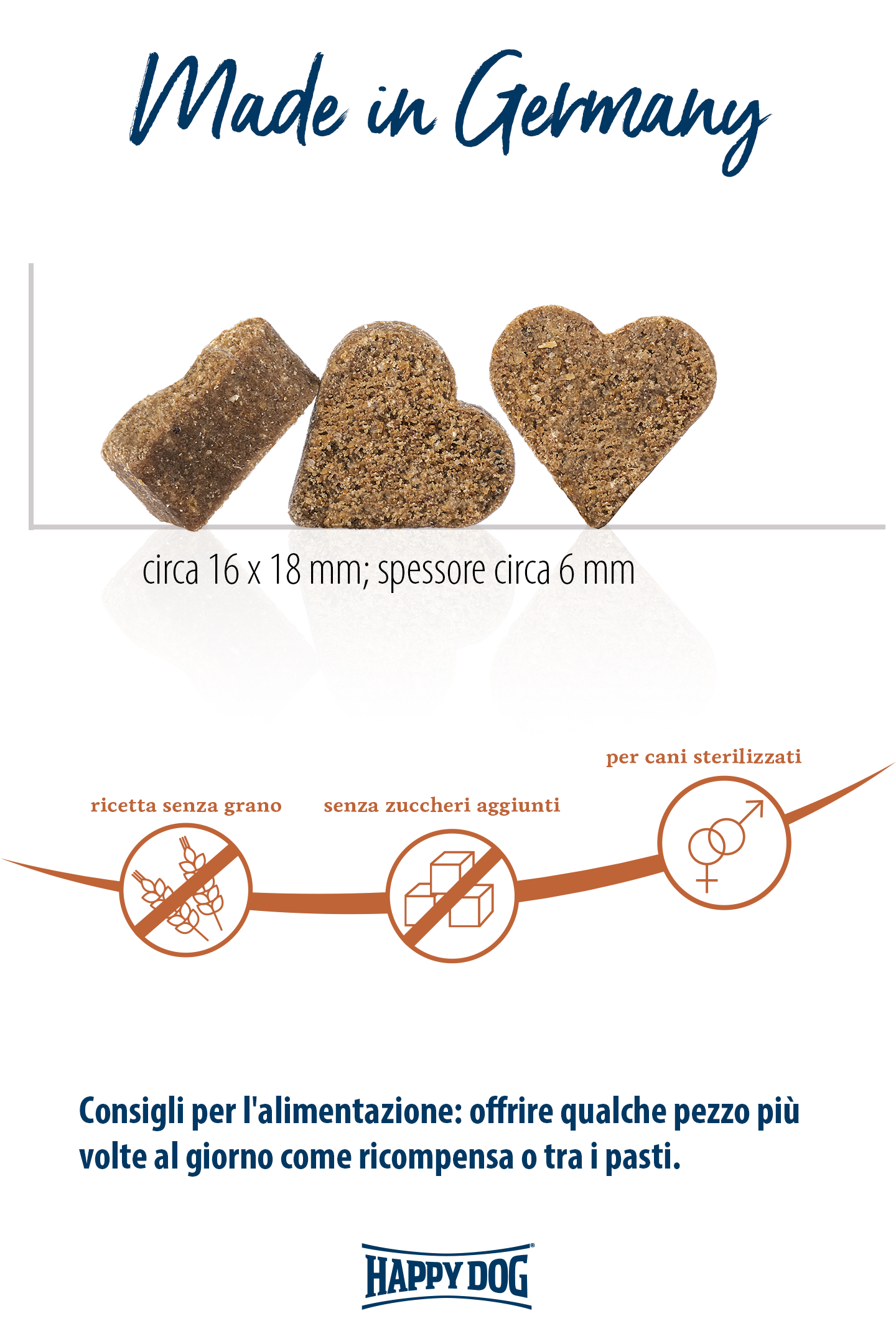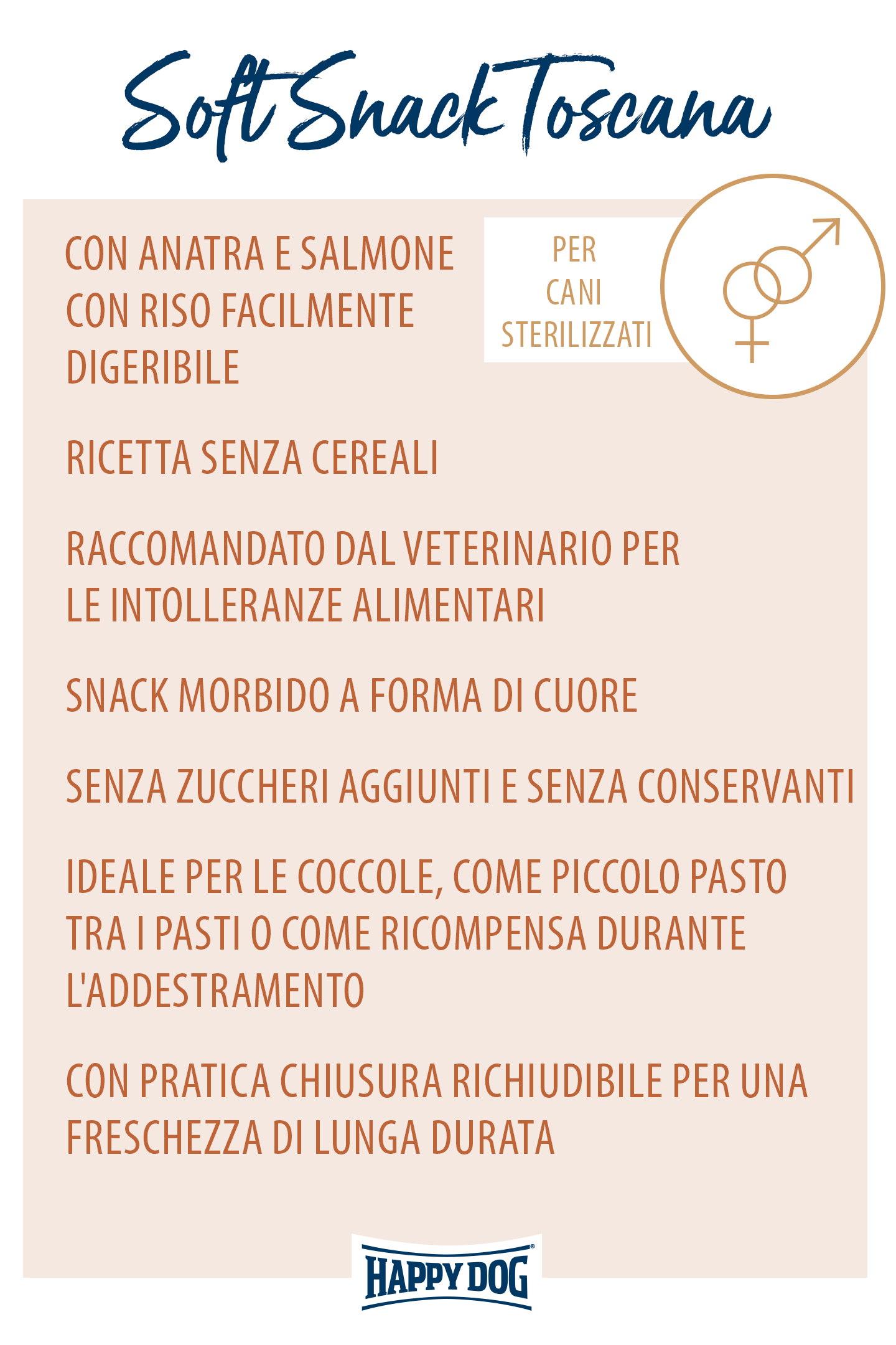 I morbidi Snack Toscana a forma di cuore sono adatti sia per coccolarlo che come piccolo spuntino fra un pasto e l’altro. L'anatra facilmente digeribile, il raffinato salmone e l’aggiunta di erbe aromatiche mediterranee sono un'esperienza di gusto per i buongustai più esigenti. La ricetta senza grano con un moderato contenuto di grassi è ideale per cani di taglia media e grande in sovrappeso, sterilizzati ed esigenti. Questi snack sono prodotti senza l’aggiunta di zuccheri e conservanti. Le buste sono richiudibili, permettendo così di mantenere gli snack sempre freschi.