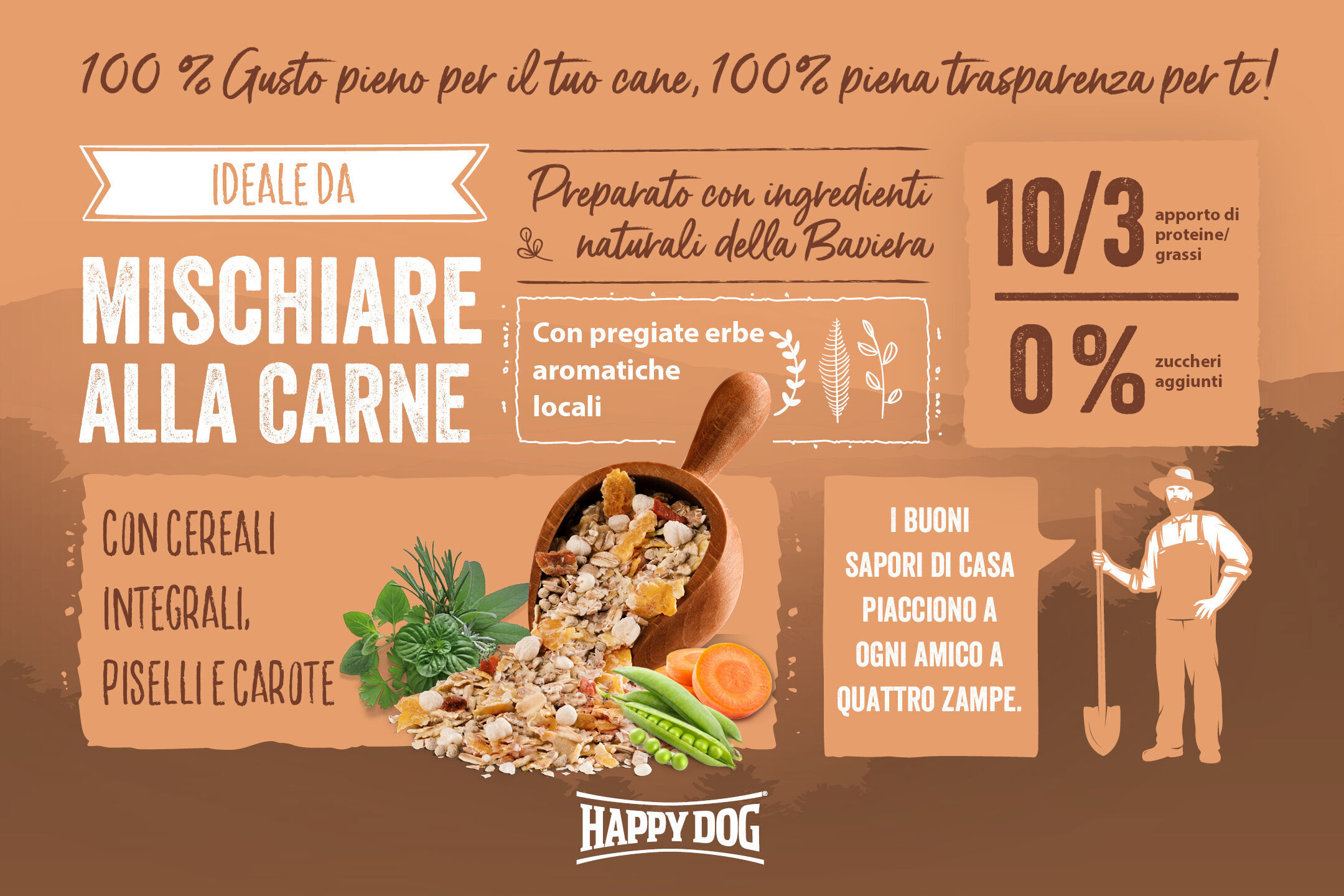 Happy Dog NaturCroq FlockenMixer contiene fiocchi pregiati e altamente digeribili, fiocchi integrali, verdure, erbe ed è arricchito con tutte le vitamine e i minerali essenziali. Le carote e i piselli apportano importanti fibre e contengono anche carotene e proteine vegetali. Happy Dog NaturCroq FlockenMixer offre quindi il perfetto completamento di ogni pasto a base di carne e assicura un'alimentazione idonea e bilanciata con la carne.