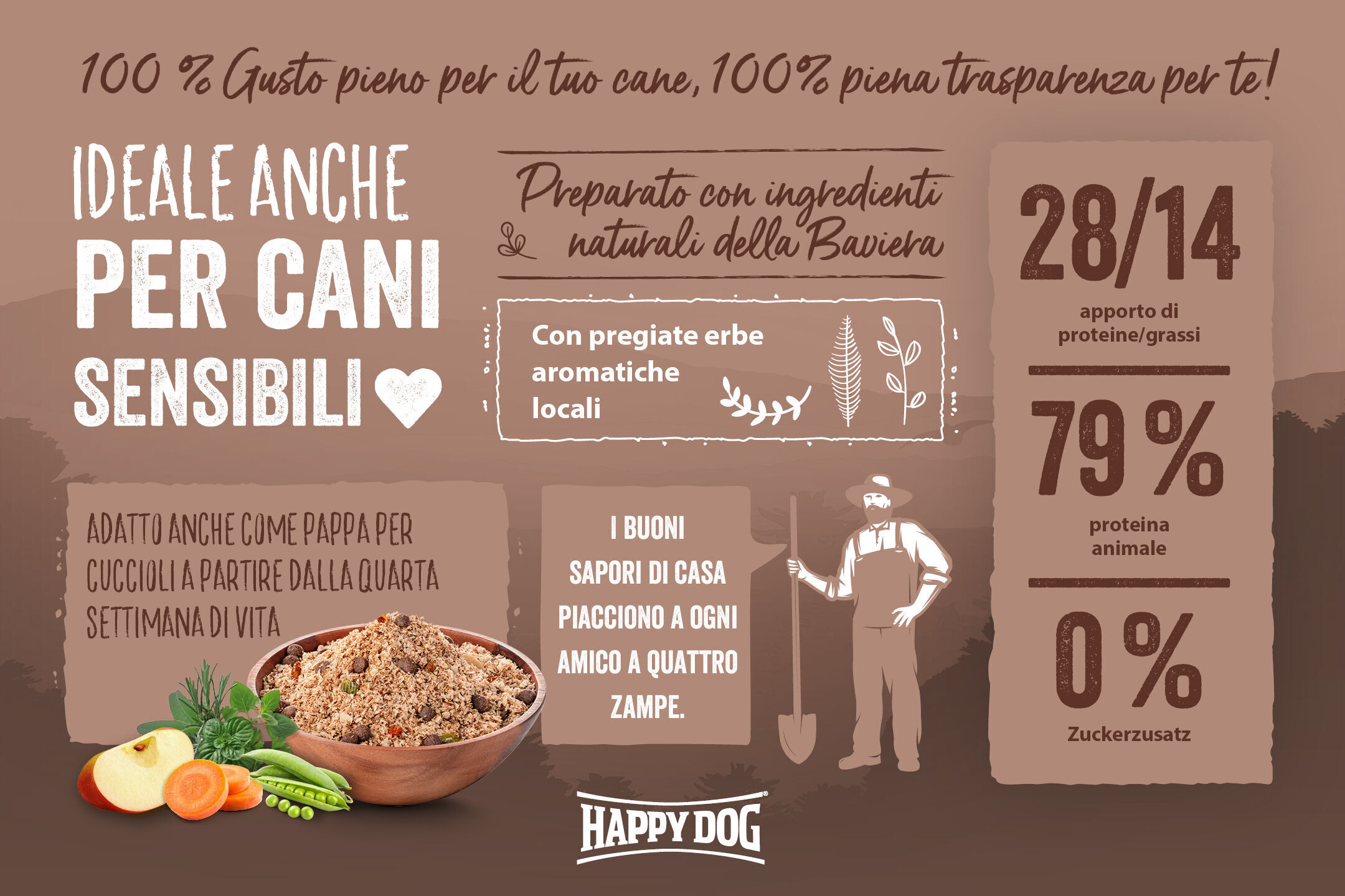 Happy Dog NaturCroq alimento completo in fiocchi è l'alimento completo ideale per cani con fabbisogno energetico da normale a leggermente alto e per cuccioli a partire dalla 4° settimana di vita. Questo alimento in fiocchi, facilmente digeribile e sano, è adatto anche per i cani nutrizionalmente sensibili, in quanto contiene una proporzione equilibrata di proteine e grassi animali e carboidrati, completamente scomposti sotto e forma di speciali fiocchi di mais domestico maturato al sole a strato sottile. Grazie a erbe selezionate e verdure pregiate che completano la ricetta, arricchita con tutte le vitamine e i minerali essenziali, il cane ha tutto ciò di cui ha bisogno e ne modo migliore. I cani con stomaci e intestini sensibili saranno particolarmente soddisfatti di questo delicato alimento a fiocchi. Grazie ai fiocchi di cereali completamente solubilizzati e alla varietà proteica bilanciata, Happy Dog NaturCroq alimento completo in fiocchi è adatto anche come purea per cuccioli a partire dalla quarta settimana.